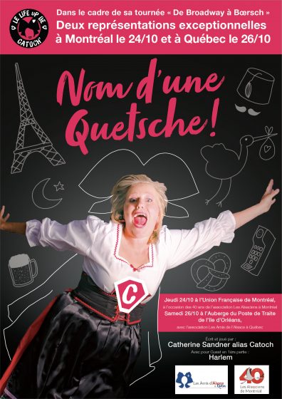 Cerise sur le Forêt Noire, Catoch’, une humoriste made in Alsace, sera avec nous pour une représentation exceptionnelle de son spectacle « Nom d’une Quetsche ! », offerte par Les alsaciens de Montréal. Son One-Woman-Feel-Trop-Good-Show raconte le fabuleux destin d’une expatriée alsacienne à … Paris ! Pour avoir un avant-goût de son univers, allez donc voir sa page Facebook et sa chaîne YouTube « Le Life-Up de Catoch »